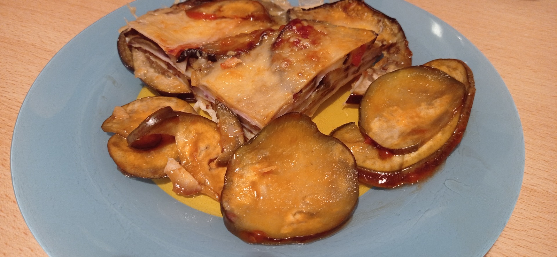 La primera capa es de berenjena......ahora cubrimos con un poco de tomate frito, ponemos una pizca de orégano y una pizca de queso rallado, luego una capa de pavo o jamón de york...otra de berenjena....volvemos a pincelar con tomate frito,.....un poco de orégano y ....ahora lonchas de queso.......más berenjena......pincelada de tomate frito.....más un poco de orégano y queso rallado...y así hasta finalizar con una capa de berenjena. (Podéis poner las capas que queráis).