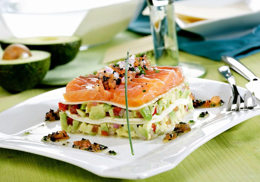Cogemos un cortapastas ó molde redondo y lo ponemos en un plato. A continuación como base ponemos una rodaja de tomate (echamos un poco de sal y orégano encima), ponemos una rodaja de queso, una de pepino, la cebolleta y un poco de salmón ahumado encima, y así sucesivamente, hasta terminar con salmón ahumado, y ponemos encima el huevo picadito.