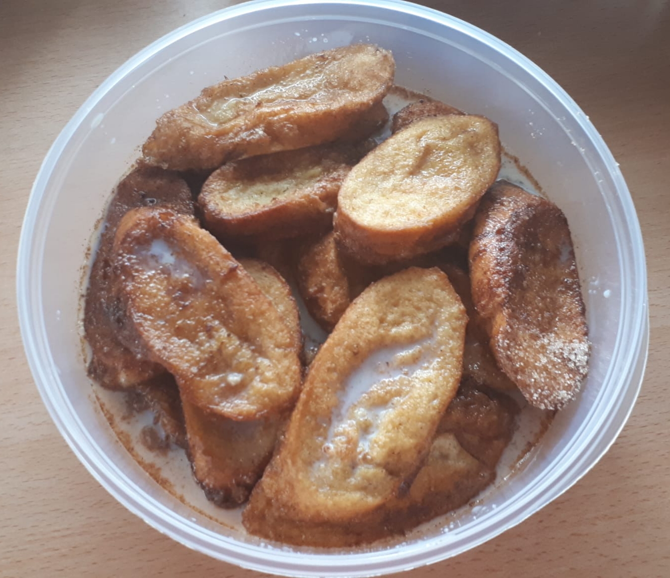 Leche + huevo + aceite + escurridor + azúcar con canela y luego al tuper.